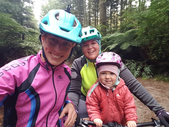 While still using the trailer frequently, when biker baby was about 9 months old we bought a second hand front-mounted ibert seat from friends, which felt like a huge pedal forwards in terms of both agility for whichever mum was riding, as well as the rider experience for the wee one. Bundled in a ski suit, merino mittens and bonnet (with helmet on top of course), we could cruise some of the narrower trails in our spectacular Whakarewarewa backyard, climb some steeper hills, and go much faster. It was a couple of months after the arrival of the front seat that baby biker started yelling “Happy!” at top volume and with no warning as we rode (she still does this a lot and it still provides much joy to all who hear it).