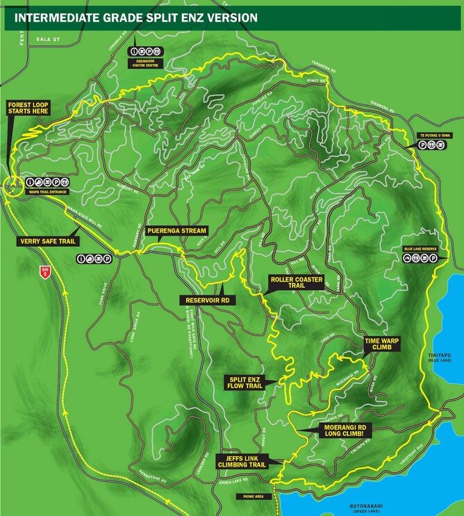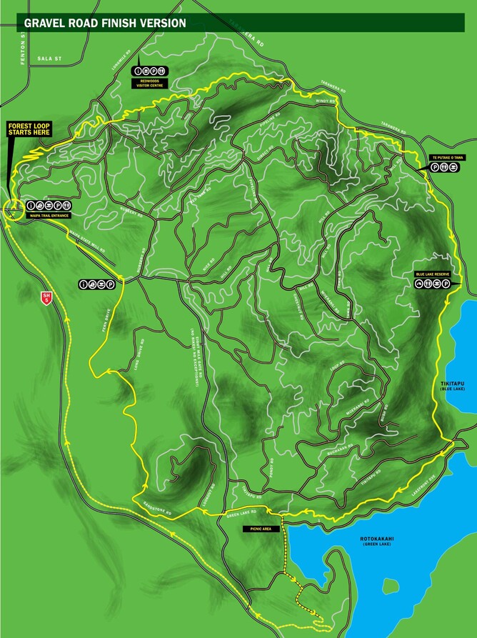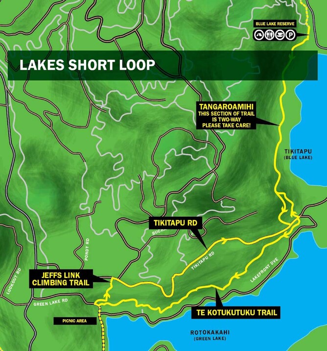 Here is a way to use the Forest Loop to take a shorter ride along some of the best bits, with views of Lake Rotokakahi (otherwise known as the Green Lake).