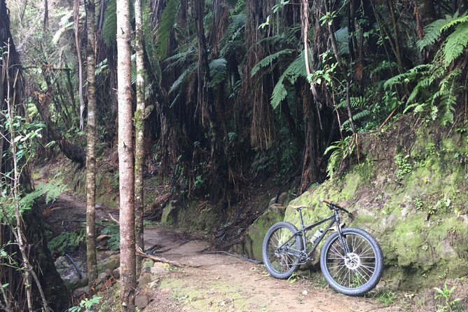 On the short gravel road section where the Forest Loop uses Windy Road, look for the entrance to Apumoana on your right. This trail is a very nice way to gain a lot of altitude without too much effort. In trees for the entire climb, Apumoana is a very easy grade trail. Look out for a couple of clearly signposted places where technical trails cross your path, and stop to catch your breath as often as you need. It is a long climb, but really doable!