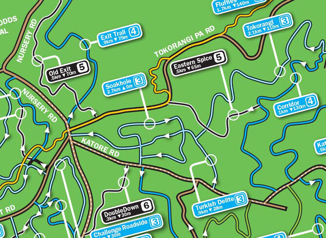 The block at the top of the Nursery Road hill between Katore Road and Tokorangi Pa Road has been logged. That area contained Turkish Delight, Soakhole, and the finish of Corridor, Eastern Spice, North face and Tokorangi.