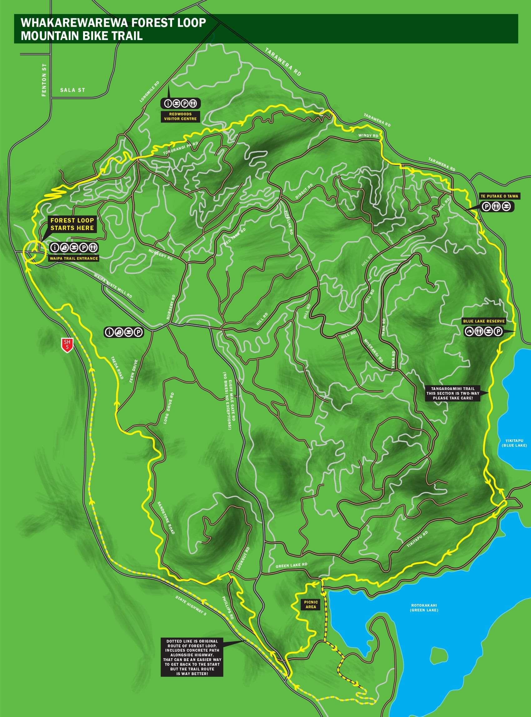 The Loop is designed so that the start - finish is at the Waipa entrance to the forest, and is to be ridden in a clockwise direction. That doesn't mean you can't start anywhere else! It is to be ridden clockwise though, many segments are one-way trail for safety.